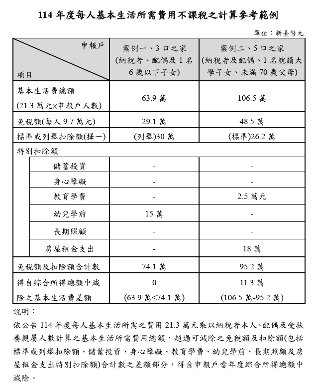 財政部表示,114年度調高基本生活所需之費用金額,預估適用戶數約202萬戶(較113年度增加5萬戶),減稅利益129億元(較113年度增加12億元),民眾於115年5月申報114年度綜合所得稅時適用。(計算說明詳參考範例)